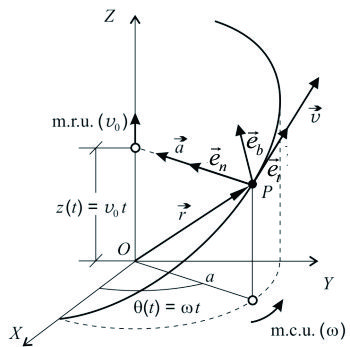 Movimiento que resulta de la superposición de un movimiento circular uniforme (m.c.u.) en un plano y de un movimiento rectilíneo uniforme (m.r.u.) a lo largo de