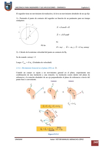 MEC%u00c1NICA PARA INGENIER%u00cdA Y SUS APLICACIONES %u2013DIN%u00c1MICA Cap%u00edtulo IIUNASAM Autor: V%u00cdCTOR MANUEL MENACHO L%u00d3PEZ 142El seguidor tiene un movimiento de traslaci%u00f3n y la leva un movimiento alrededor de un eje fijo1).-Poniendo el punto de contactodel seguidor en funci%u00f3n de un par%u00e1metro para un tiempo cualquieraSi:, y 2).-C%u00e1lculo de la m%u00e1xima velocidad del punto en contacto de B2:Se da cuando Luego: (Unidades de velocidad)2.5.2.-Movimiento General en el plano (XY) en .Cuando un cuerpo se sujeta a un movimiento general en el plano, experimenta una combinaci%u00f3n de una traslaci%u00f3n y una rotaci%u00f3n. La traslaci%u00f3n ocurre dentro del plano de referencia y la rotaci%u00f3n alrededor de un eje perpendicular al plano de referencia a trav%u00e9s del punto base o conveniente.P2-1aFigura F2-5.3