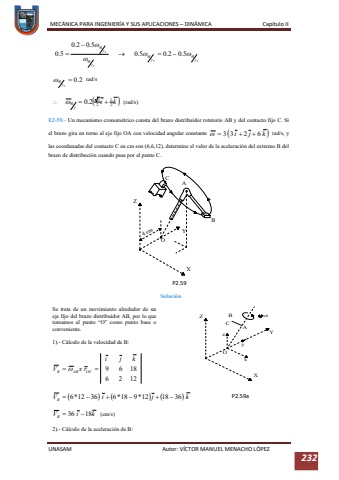 MEC%u00c1NICA PARA INGENIER%u00cdA Y SUS APLICACIONES %u2013DIN%u00c1MICA Cap%u00edtulo IIUNASAM Autor: V%u00cdCTOR MANUEL MENACHO L%u00d3PEZ 232rad/s%uf05c(rad/s)E2-59.-Un mecanismo cronom%u00e9trico consta del brazo distribuidor rotatorio AB y del contacto fijo C. Si el brazo gira en torno al eje fijo OA con velocidad angular constante rad/s, y las coordenadas del contacto C en cm son (6,6,12), determine el valor de la aceleraci%u00f3n del extremo B del brazo de distribuci%u00f3n cuando pasa por el punto C.Soluci%u00f3nSe trata de un movimiento alrededor de un eje fijodel brazo distribuidor AB, por lo que tomamos al punto %u201cO%u201d como punto base o conveniente. 1).C%u00e1lculo de la velocidad de B:(cm/s)2).-C%u00e1lculo de la aceleraci%u00f3n de B:P2.59P2.59a