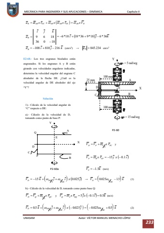 MEC%u00c1NICA PARA INGENIER%u00cdA Y SUS APLICACIONES %u2013DIN%u00c1MICA Cap%u00edtulo IIUNASAM Autor: V%u00cdCTOR MANUEL MENACHO L%u00d3PEZ 233(cm/s2) %u2192 cm/s2E2-60.-Los tres engranes biselados est%u00e1n engranados. Si los engranes A y B est%u00e1n girando con velocidades angulares indicadas, determine la velocidad angular del engrane C alrededor de la flecha DE. %u00bfCu%u00e1l es la velocidad angular de DE alrededor del eje %u201cY%u201d?Soluci%u00f3n1).C%u00e1lculo de la velocidad angular de %u201cC%u201d respecto a DE:a).-C%u00e1lculo de la velocidad de D, tomando como punto de base P:y(m/s)%u2192 (1)b).-C%u00e1lculo de la velocidad de D, tomando como punto base Q:y (m/s)(2)P260P2-60a