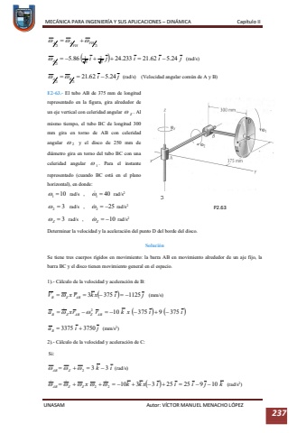 MEC%u00c1NICA PARA INGENIER%u00cdA Y SUS APLICACIONES %u2013DIN%u00c1MICA Cap%u00edtulo IIUNASAM Autor: V%u00cdCTOR MANUEL MENACHO L%u00d3PEZ 237(rad/s)(rad/s) (Velocidad angular com%u00fan de A y B)E2-63.-El tubo AB de 375 mm de longitud representado en la figura, gira alrededor de un eje vertical con celeridad angular . Al mismo tiempo, el tubo BC de longitud 300 mm gira en torno de AB con celeridad angular y el disco de 250 mm de di%u00e1metro gira en torno del tubo BC con una celeridad angular . Para el instante representado (cuando BC est%u00e1 en el plano horizontal), en donde:rad/s, rad/s2rad/s, rad/s2rad/s, rad/s2Determinar la velocidad y la aceleraci%u00f3n del punto D del borde del disco.Soluci%u00f3nSe tiene tres cuerpos r%u00edgidos en movimiento: la barra AB en movimiento alrededor de un aje fijo, la barra BC y el disco tienen movimiento general en el espacio.1).-C%u00e1lculo de la velocidad y aceleraci%u00f3n de B:(mm/s)(mm/s2)2).-C%u00e1lculo de la velocidad y aceleraci%u00f3n de C:Si:(rad/s)(rad/s2)P2.63%uf0c1