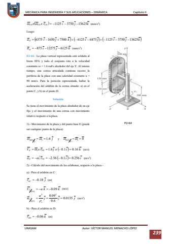 MEC%u00c1NICA PARA INGENIER%u00cdA Y SUS APLICACIONES %u2013DIN%u00c1MICA Cap%u00edtulo IIUNASAM Autor: V%u00cdCTOR MANUEL MENACHO L%u00d3PEZ 239(mm/s2)Luego:(mm/s2)E2-64.-La placa vertical representada est%u00e1 soldada al brezo EFG y todo el conjunto rota a la velocidad constante %u03c91 = 1.6 rad/salrededor del eje Y. Al mismo tiempo, una correa articulada continua recorre la periferia de la placa con una celeridad constante u = 90 mm/s. Para la posici%u00f3n representada, hallar la aceleraci%u00f3n del eslab%u00f3n de la correa situado: a) en el punto C, y b) en el punto D.Soluci%u00f3nSe tiene el movimiento de la placa alrededor de un eje fijo y el movimiento de una correa con movimiento relativo respecto a la placa.1).-Movimiento de la placa y del punto base E (puede ser cualquier punto de la placa):y (m/s)(m/s2)2).-C%u00e1lculo del movimiento de los eslabones, respecto a la placa.-a).-Para el eslab%u00f3n en C:(m)(m/s)(m/s2)b).-Para el eslab%u00f3n en D:(m)P2-64%uf0c1