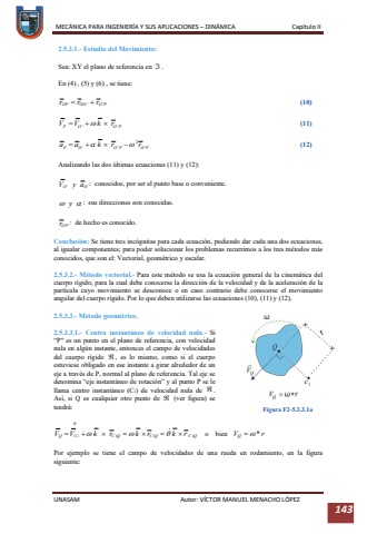 MEC%u00c1NICA PARA INGENIER%u00cdA Y SUS APLICACIONES %u2013DIN%u00c1MICA Cap%u00edtulo IIUNASAM Autor: V%u00cdCTOR MANUEL MENACHO L%u00d3PEZ 1432.5.3.1.-Estudio del Movimiento:Sea: XY el plano de referencia en .En (4) , (5) y (6) , se tiene:(10)(11)(12)Analizando las dos %u00faltimas ecuaciones (11) y (12):: conocidos, por ser el punto base o conveniente.:sus direcciones son conocidas.: de hecho es conocido.Conclusi%u00f3n: Setiene tres inc%u00f3gnitas para cada ecuaci%u00f3n, pudiendo dar cada una dos ecuaciones, al igualar componentes; para poder solucionar los problemas recurrimos a los tres m%u00e9todos m%u00e1s conocidos, que son el: Vectorial, geom%u00e9trico y escalar.2.5.3.2.-M%u00e9todo vectorial.-Para este m%u00e9todo se usa la ecuaci%u00f3n general de la cinem%u00e1tica del cuerpo r%u00edgido, para la cual debe conocerse la direcci%u00f3n de la velocidad y de la aceleraci%u00f3n de la part%u00edcula cuyo movimiento se desconoce o en caso contrario debe conocerse el movimiento angular del cuerpo r%u00edgido. Por lo que deben utilizarse las ecuaciones (10), (11) y (12).2.5.3.3.-M%u00e9todo geom%u00e9trico.2.5.3.3.1.-Centro instant%u00e1neo de velocidad nula.-Si %u201cP%u201d es un punto en el plano de referencia, con velocidad nula en alg%u00fan instante, entonces el campo de velocidades del cuerpo r%u00edgido , es lo mismo, como si el cuerpo estuviese obligado en ese instante a girar alrededor de un eje a trav%u00e9s de P, normal al plano de referencia. Tal eje se denomina %u201ceje instant%u00e1neo de rotaci%u00f3n%u201d y al punto P se le llama centro instant%u00e1neo (Ci) de velocidad nula de . As%u00ed, si Q es cualquier otro punto de (ver figura) se tendr%u00e1:o bien Por ejemplo se tiene el campo de velocidades de una rueda en rodamiento, en la figura siguiente:Figura F2-5.3.3.1a