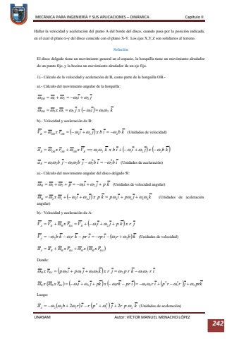 MEC%u00c1NICA PARA INGENIER%u00cdA Y SUS APLICACIONES %u2013DIN%u00c1MICA Cap%u00edtulo IIUNASAM Autor: V%u00cdCTOR MANUEL MENACHO L%u00d3PEZ 242Hallar la velocidad y aceleraci%u00f3n del punto A del borde del disco, cuando pasa por la posici%u00f3n indicada, en el cual el plano x-y del disco coincide con el plano X-Y. Los ejes X,Y,Z son solidarios al terreno.Soluci%u00f3nEl disco delgado tiene un movimiento general en el espacio, la horquilla tiene un movimiento alrededor de un punto fijo, y la bocina un movimiento alrededor de un eje fijo.1).-C%u00e1lculo de la velocidad y aceleraci%u00f3n de B, como parte de la horquilla OB.-a).-C%u00e1lculo del movimiento angular de la horquilla:b).Velocidad y aceleraci%u00f3n de B:(Unidades de velocidad)(Unidades de aceleraci%u00f3n)a).-C%u00e1lculo del movimiento angular del disco delgado %uf0c2:(Unidades de velocidad angular)(Unidades de aceleraci%u00f3n angular)b).-Velocidad y aceleraci%u00f3n de A:(Unidades de velocidad)Donde:Luego:(Unidades de aceleraci%u00f3n)
