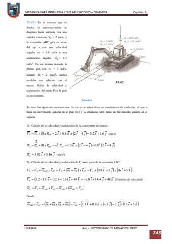 MEC%u00c1NICA PARA INGENIER%u00cdA Y SUS APLICACIONES %u2013DIN%u00c1MICA Cap%u00edtulo IIUNASAM Autor: V%u00cdCTOR MANUEL MENACHO L%u00d3PEZ 243E2-67.-En el instante que se ilustra, la retroexcavadora se desplaza hacia adelante con una rapidez constante V0= 2 pie/s, y la extensi%u00f3n ABC gira en torno del eje z con una velocidad angular %u03c91= 0.8 rad/s y una aceleraci%u00f3n angular = 1.3 rad/s2. En ese mismo instante la pluma gira con %u03c92= 3 rad/s, cuando = 2 rad/s2, ambos medidas con relaci%u00f3n con el marco. Hallar la velocidad y aceleraci%u00f3n del punto P en la pala en ese instante.Soluci%u00f3nSe tiene los siguientes movimientos: la retroexcavadora tiene un movimiento de traslaci%u00f3n, el marco tiene un movimiento general en el plan (xy) y la extensi%u00f3n ABC tiene un movimiento general en el espacio.1).-C%u00e1lculo de la velocidad y aceleraci%u00f3n de A, como parte del marco:(pie/s)(pie/s2)2).C%u00e1lculo de la velocidad y aceleraci%u00f3n de P, como parte de la extensi%u00f3n ABC:(Unidades de velocidad)Donde:P2-67