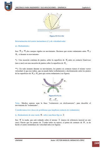 MEC%u00c1NICA PARA INGENIER%u00cdA Y SUS APLICACIONES %u2013DIN%u00c1MICA Cap%u00edtulo IIUNASAM Autor: V%u00cdCTOR MANUEL MENACHO L%u00d3PEZ 144Determinaci%u00f3n del centro instant%u00e1neo (Ci) de velocidad nula:a).-Rodamiento.-Sea: y dos cuerpos r%u00edgidos en movimiento. Decimos que existe rodamiento entre y si durante su movimiento:*).-Una sucesi%u00f3n continua de puntos, sobre la superficie de entra en contacto biun%u00edvoco (uno a uno) con una sucesi%u00f3n de puntos sobre la superficie de .**).-En todo instante durante su movimiento, los puntos en contacto tienen el mismo vector velocidad, lo que nos indica, que no puede haber resbalamiento o deslizamiento entre los puntos de las superficies de y para que exista rodamiento (ver figura).Nota.-Muchos autores usan la frase \movimiento de \Consideramos tres clases de problemas que implican contacto de rodamiento:i).-Rodamiento de una rueda , sobre una l%u00ednea fija en Sea: la rueda, que est%u00e1 rodando sobre el terreno (marco de referencia inercial en este caso). Puesto que los puntos de est%u00e1n todos en reposo, el punto de contacto de , es de hecho elcentro instant%u00e1neo de velocidad nula (ver figura).Figura F2-5.3.3.1bFigura F2-5.3.1c