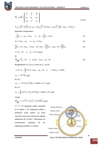 MEC%u00c1NICA PARA INGENIER%u00cdA Y SUS APLICACIONES %u2013DIN%u00c1MICA Cap%u00edtulo IIUNASAM Autor: V%u00cdCTOR MANUEL MENACHO L%u00d3PEZ 254Igualando componentes:(1)(2)(3)pies/sSi:(4)Remplazando (1), (2) y el valor de en (4):rad/sEn (2):rad/sEn (1):rad/sLuego:(rad/s)E1-73.-El engranaje anular mostrado en la figura y los engranajes pi%u00f1%u00f3n y perif%u00e9rico est%u00e1n unidos. La barra conectora tiene una aceleraci%u00f3n angular antihoraria de 10 rad/s2. Determinar las aceleraciones angulares de los engranajes perif%u00e9rico y central.P172a