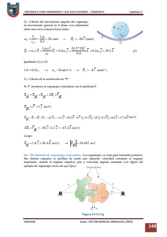 MEC%u00c1NICA PARA INGENIER%u00cdA Y SUS APLICACIONES %u2013DIN%u00c1MICA Cap%u00edtulo IIUNASAM Autor: V%u00cdCTOR MANUEL MENACHO L%u00d3PEZ 1482).C%u00e1lculo del movimiento angular del engranaje, en movimiento general en el plano con rodamiento sobre una curva c%u00f3ncava hacia abajo:rad/s%u2192(rad/s)(2)Igualando (1) y (2):rad/s2%u21bb(rad/s2)3).-C%u00e1lculo de la aceleraci%u00f3n de %u201cP%u201d:Si: P%u2019 pertenece al engranaje coincidente con la part%u00edcula P(m/s2)(m/s2)(m/s2)Luego:(m/s2) m/s2iii).-Movimiento de engranajesconectados.-Los engranajes, se usan para transmitir potencia. Sus dientes engranes se perfilan de modo que impartan velocidad constante al engrane impulsado, cuando el engrane impulsor gira a velocidad angular constante (ver figura del ejemplo de engranajes rectos de ejes fijos).Figura F2-5.3.1g
