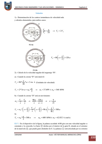 MEC%u00c1NICA PARA INGENIER%u00cdA Y SUS APLICACIONES %u2013DIN%u00c1MICA Cap%u00edtulo IIUNASAM Autor: V%u00cdCTOR MANUEL MENACHO L%u00d3PEZ 153Soluci%u00f3n1).-Determinaci%u00f3n de los centros instant%u00e1neos de velocidad nula y c%u00e1lculos elementales, para ambos casos:2).-C%u00e1lculo de la velocidad angular del engranaje %u201cB%u201d:a).Cuando la corona %u201cD%u201d est%u00e1 inm%u00f3vil:(Unidades de velocidad)%u00f3 RPMb).-Cuando la corona %u201cD%u201d est%u00e1 en movimiento:Si:RPM %u00f3 %u21bb(rad/s)E2-7.-En el dispositivo de la figura, la palanca acodada AOB gira con una velocidad angular %u03c9 constante y la conocida. La barra %u2462desliza por el interior de la gu%u00eda D, situada en el extremo de la manivela %u2463, que puede girar alrededor de E. La palanca %u2460est%u00e1 articulada por su extremo P2-6aP2-6b