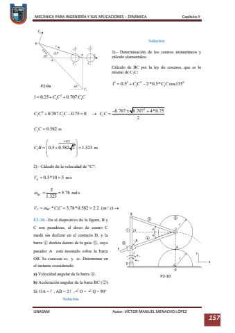 MEC%u00c1NICA PARA INGENIER%u00cdA Y SUS APLICACIONES %u2013DIN%u00c1MICA Cap%u00edtulo IIUNASAM Autor: V%u00cdCTOR MANUEL MENACHO L%u00d3PEZ 157Soluci%u00f3n1).-Determinaci%u00f3n de los centros instant%u00e1neos y c%u00e1lculo elementales:C%u00e1lculo de BC por la ley de cosenos, que es lo mismo de C1C:mm2).C%u00e1lculo de la velocidad de %u201cC%u201d: m/srad/sE2-10.-En el dispositivo de la figura, B y C son pasadores, el disco de centro C rueda sin deslizar en el contacto D, y la barra %u2463desliza dentro de la gu%u00eda %u2464, cuyo pasadorA est%u00e1 montado sobre la barra OB. Se conocen %u03c91y %u03b11. Determinar en el instante considerado:a)Velocidad angular de la barra %u2463.b)Aceleraci%u00f3n angular de la barra BC (%u2461)Si: OA =, AB = 2,O = Q = 90%u00b0Soluci%u00f3nP29aP2-10