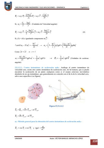 MEC%u00c1NICA PARA INGENIER%u00cdA Y SUS APLICACIONES %u2013DIN%u00c1MICA Cap%u00edtulo IIUNASAM Autor: V%u00cdCTOR MANUEL MENACHO L%u00d3PEZ 159Si, (Unidades de Velocidad angular)(4)Si, (3) = (4) e igualando componente en:%u2192Como %u21bb(Unidades de acelerac.angular)2.5.3.3.2.-Centro instant%u00e1neo de aceleraci%u00f3n nula.-An%u00e1logo al centro instant%u00e1neo de velocidad cero, existe otro centro instant%u00e1neo de aceleraci%u00f3n cero, de tal manera, que se pueda encontrar la aceleraci%u00f3n de unpunto cualquiera como si el cuerpo estuviese movi%u00e9ndose alrededor de un eje instant%u00e1neo, que generalmente no coincide con el de la de la velocidad cero, salvo caso espec%u00edfico (ver figura).a).-M%u00e9todo general para la obtenci%u00f3n del centro instant%u00e1neo de aceleraci%u00f3n nula.-y Figura F2-5.3.3.2