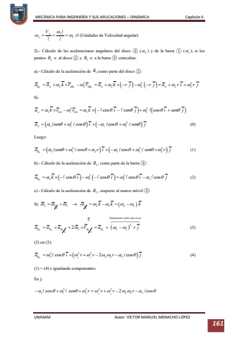 MEC%u00c1NICA PARA INGENIER%u00cdA Y SUS APLICACIONES %u2013DIN%u00c1MICA Cap%u00edtulo IIUNASAM Autor: V%u00cdCTOR MANUEL MENACHO L%u00d3PEZ 161%u21ba(Unidades de Velocidad angular)2).-C%u00e1lculo de las aceleraciones angulares del disco %u2461()y de la barra %u2460(), si los puntos al disco %u2461y a la barra %u2462coinciden.a).-C%u00e1lculo de la aceleraci%u00f3n de como parte del disco %u2461:Si:(0)Luego:(1)b).C%u00e1lculo de la aceleraci%u00f3n de , como parte de la barra %u2462:(2)c).-C%u00e1lculo de la aceleraci%u00f3n de , respecto al marcom%u00f3vil %u2462:Si: (3)(2) en (3):(4)(1) = (4) e igualando componentes:En j: