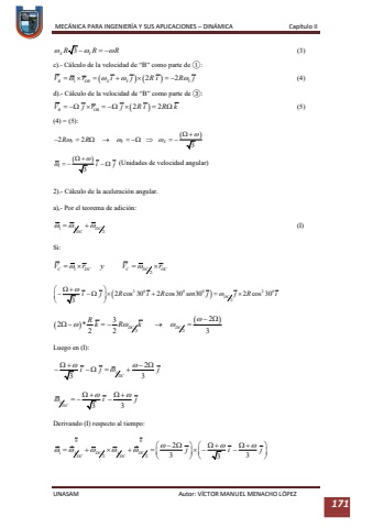 MEC%u00c1NICA PARA INGENIER%u00cdA Y SUS APLICACIONES %u2013DIN%u00c1MICA Cap%u00edtulo IIUNASAM Autor: V%u00cdCTOR MANUEL MENACHO L%u00d3PEZ 171(3)c).-C%u00e1lculo de la velocidad de %u201cB%u201d como parte de %u2460:(4)d).-C%u00e1lculo de la velocidad de %u201cB%u201d como partede %u2462:(5)(4) = (5):(Unidades de velocidad angular)2).-C%u00e1lculo de la aceleraci%u00f3n angular.a),-Por el teorema de adici%u00f3n:(I)Si: Luego en (I):Derivando (I)respecto al tiempo: