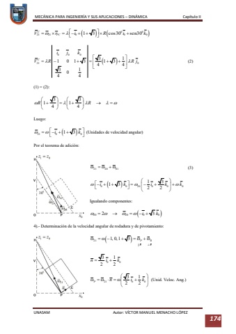 MEC%u00c1NICA PARA INGENIER%u00cdA Y SUS APLICACIONES %u2013DIN%u00c1MICA Cap%u00edtulo IIUNASAM Autor: V%u00cdCTOR MANUEL MENACHO L%u00d3PEZ 174(2)(1) = (2):Luego:(Unidades de velocidad angular)Por el teorema de adici%u00f3n:(3)Igualando componentes:4).-Determinaci%u00f3n de la velocidad angular de rodadura y de pivotamiento:(Unid. Veloc. Ang.)
