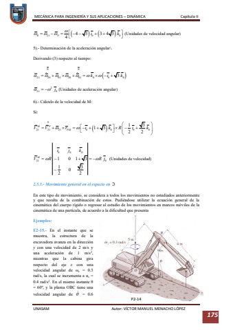 MEC%u00c1NICA PARA INGENIER%u00cdA Y SUS APLICACIONES %u2013DIN%u00c1MICA Cap%u00edtulo IIUNASAM Autor: V%u00cdCTOR MANUEL MENACHO L%u00d3PEZ 175(Unidades de velocidad angular)5).Determinaci%u00f3nde la aceleraci%u00f3n angular\\.Derivando (3) respecto al tiempo:(Unidades de aceleraci%u00f3n angular)6).-C%u00e1lculo de la velocidad de M:Si:(Unidades de velocidad)2.5.5.-Movimiento general en el espacio en En este tipo de movimiento, se considera a todos los movimientos no estudiados anteriormentey que resulta de la combinaci%u00f3n de estos. Pudi%u00e9ndose utilizar la ecuaci%u00f3n general de la cinem%u00e1ticadel cuerpo r%u00edgido o regresar al estudio de los movimientos en marcos m%u00f3viles de la cinem%u00e1tica de una part%u00edcula, de acuerdo a la dificultad que presentaEjemplos:E2-15.-En el instante que se muestra, la estructura de la excavadora avanza en la direcci%u00f3n ycon una velocidad de 2 m/s y una aceleraci%u00f3n de 1 m/s2, mientras que la cabina gira respecto del eje zcon una velocidad angular de %u03c9z= 0.3 rad/s, la cual se incrementa a %u03b1z= 0.4 rad/s2. En el mismo instante %u03b8 = 60%u00ba, y la pluma OBC tiene una velocidad angular de = 0.6 P2-14