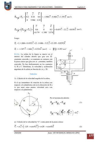 MEC%u00c1NICA PARA INGENIER%u00cdA Y SUS APLICACIONES %u2013DIN%u00c1MICA Cap%u00edtulo IIUNASAM Autor: V%u00cdCTOR MANUEL MENACHO L%u00d3PEZ 177(m/s2)(m/s2)Luego:(m/s2) %u2192m/s2E2-16.-Laesfera de la figura se mueve en el interiordel cilindro abierto que gira con constanteconocida, y se mantiene en contacto con la pieza c%u00f3nica que gira conconstante, tambi%u00e9n conocida. No hay deslizamiento en los contactos A, B y C.Determine, la velocidad y aceleraci%u00f3nangulares de la esfera en funci%u00f3n de y .Soluci%u00f3n1).-C%u00e1lculo de la velocidad angular de la esfera.Si el eje instant%u00e1neo de rotaci%u00f3n de la esfera con respecto a la plataforma est%u00e1 en la direcci%u00f3n de B a A, por tener estos puntos velocidad cero con respecto a la plataforma:Por el teorema de adici%u00f3n:(1)a).-C%u00e1lculo de la velocidad de %u201cC%u201d, como parte de la pieza c%u00f3nica:(2)
