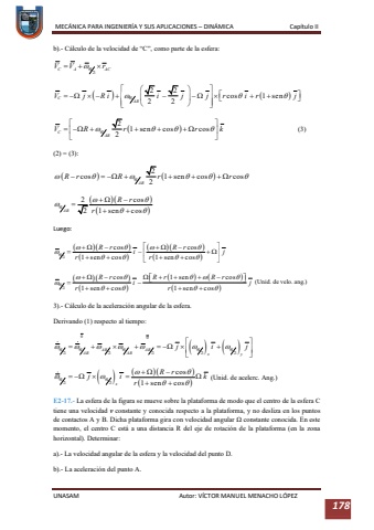 MEC%u00c1NICA PARA INGENIER%u00cdA Y SUS APLICACIONES %u2013DIN%u00c1MICA Cap%u00edtulo IIUNASAM Autor: V%u00cdCTOR MANUEL MENACHO L%u00d3PEZ 178b).-C%u00e1lculo de la velocidad de %u201cC%u201d, como parte de la esfera:(3)(2) = (3):Luego:(Unid. de velo. ang.)3).-C%u00e1lculo de la aceleraci%u00f3n angular de la esfera.Derivando (1) respecto al tiempo:(Unid. de acelerc. Ang.)E2-17.-La esfera de la figura se mueve sobre la plataforma de modo que el centro de la esfera C tiene una velocidad vconstante y conocidarespecto a la plataforma, y no desliza en los puntos de contactos A y B. Dicha plataforma gira con velocidad angular %u03a9 constante conocida. En este momento, el centro C est%u00e1 a una distancia R del eje de rotaci%u00f3n de la plataforma (en la zona horizontal). Determinar:a).-La velocidad angular de la esfera y la velocidad del punto D.b).-La aceleraci%u00f3n del punto A.