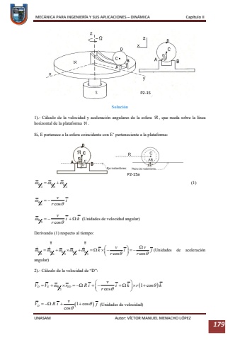 MEC%u00c1NICA PARA INGENIER%u00cdA Y SUS APLICACIONES %u2013DIN%u00c1MICA Cap%u00edtulo IIUNASAM Autor: V%u00cdCTOR MANUEL MENACHO L%u00d3PEZ 179Soluci%u00f3n1).-C%u00e1lculo de la velocidad y aceleraci%u00f3n angulares de la esfera , que rueda sobre la l%u00ednea horizontal de la plataforma .Si, E pertenece a la esfera coincidente con E%u2019perteneciente a la plataforma:(1)(Unidades de velocidad angular)Derivando (1) respecto al tiempo:(Unidades de aceleraci%u00f3n angular)2).-C%u00e1lculo de la velocidad de %u201cD%u201d:(Unidades de velocidad)%u2111P2-15P2-15a