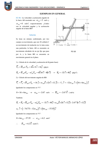 MEC%u00c1NICA PARA INGENIER%u00cdA Y SUS APLICACIONES %u2013DIN%u00c1MICA Cap%u00edtulo IIUNASAM Autor: V%u00cdCTOR MANUEL MENACHO L%u00d3PEZ 181EJEMPLOSEN GENERALE2-18.-La velocidady aceleraci%u00f3n angular de la barra AB mostrada son: rad/sy rad/s2, respectivamente. %u00bfCu%u00e1les son la velocidad angular y la aceleraci%u00f3n angular de la barra BD?Soluci%u00f3nSe tiene un sistema conformado, por tres cuerpos en movimiento, que son: El collar%u00edn C en movimiento de traslaci%u00f3n (sele trata como una part%u00edcula), la barra AB se encuentra en movimiento alrededor de un eje fijo que pasa por A, y la barra BD se encuentra en movimiento general en el plano.1).-C%u00e1lculo de la velocidad y aceleraci%u00f3n de B (punto base):(plg/s)%u2192 (plg/s2)2).-C%u00e1lculo del movimiento angular de BD:%u2192 Igualando los componentes en %u201cY%u201d:rad/s%u2192 ( rad/s)Tambi%u00e9n:Igualando los componentes en %u201cY%u201d:%u2192 rad/s2(rad/s2)P2-18%uf0c1%uf0c1