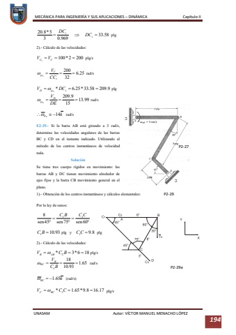 MEC%u00c1NICA PARA INGENIER%u00cdA Y SUS APLICACIONES %u2013DIN%u00c1MICA Cap%u00edtulo IIUNASAM Autor: V%u00cdCTOR MANUEL MENACHO L%u00d3PEZ 194plg2).C%u00e1lculo de las velocidades:plg/srad/splgrad/srad/sE2-29.-Si la barra AB est%u00e1 girando a 3 rad/s, determine las velocidades angulares de las barras BC y CD en el instante indicado. Utilizando el m%u00e9todo de los centros instant%u00e1neos de velocidad nula.Soluci%u00f3nSe tiene tres cuerpo r%u00edgidos en movimiento: las barras AB y DC tienen movimiento alrededor de ajes fijos y la barra CB movimiento general en el plano.1).-Obtenci%u00f3n de los centros instant%u00e1neos y c%u00e1lculos elementales:Por la ley de senos:plg y plg2).-C%u00e1lculo de las velocidades:plg/srad/s(rad/s)plg/sP2-29%uf0c1%uf0c1P227P2-29a