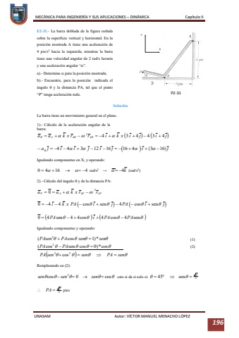 MEC%u00c1NICA PARA INGENIER%u00cdA Y SUS APLICACIONES %u2013DIN%u00c1MICA Cap%u00edtulo IIUNASAM Autor: V%u00cdCTOR MANUEL MENACHO L%u00d3PEZ 196E2-31.-La barra doblada de lafigura resbala sobre la superficie vertical y horizontal. En la posici%u00f3n mostrada A tiene una aceleraci%u00f3n de 4 pie/s2hacia la izquierda, mientras la barra tiene una velocidad angular de 2 rad/shoraria y una aceleraci%u00f3n angular %u201c%uf061%u201d.a).-Determine %uf061parala posici%u00f3n mostrada.b).-Encuentre, para la posici%u00f3n indicada el %u00e1ngulo %uf071y la distancia PA, tal que el punto %u201cP%u201d tenga aceleraci%u00f3n nula.Soluci%u00f3nLa barra tiene un movimiento general en el plano.1).-C%u00e1lculo de la aceleraci%u00f3n angular de la barra:Igualando componentes en X, y operando:rad/s2%u2192 (rad/s2)2).-C%u00e1lculo del %u00e1ngulo %uf071y de la distancia PA:Igualando componentes y operando:(1)(2)Remplazandoen (2):esto si da si solo si: piesP231%uf0c1