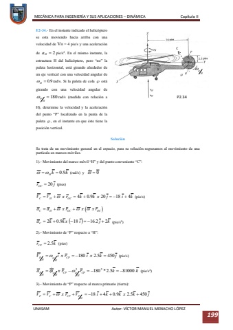 MEC%u00c1NICA PARA INGENIER%u00cdA Y SUS APLICACIONES %u2013DIN%u00c1MICA Cap%u00edtulo IIUNASAM Autor: V%u00cdCTOR MANUEL MENACHO L%u00d3PEZ 199E2-34.-En el instante indicado el helic%u00f3ptero se esta moviendo hacia arriba con una velocidad de VH= 4 pie/sy una aceleraci%u00f3n de pie/s2. En el mismo instante, la estructura H del helic%u00f3ptero, pero %u201cno%u201d la paleta horizontal, est%u00e1 girando alrededor de un eje vertical con una velocidad angular de rad/s. Si la paleta de cola %uf0c3est%u00e1 girando con una velocidad angular de rad/s(medida con relaci%u00f3n a H), determine la velocidad y la aceleraci%u00f3n del punto %u201cP%u201d localizado en la punta de la paleta %uf0c3, en el instante en que %u00e9ste tiene la posici%u00f3n vertical.Soluci%u00f3nSe trata de un movimiento general en el espacio, para su soluci%u00f3n regresamos al movimiento de una part%u00edcula en marcos m%u00f3viles.1).-Movimiento del marco m%u00f3vil %u201cH%u201d y del punto conveniente %u201cC%u201d:(rad/s) y (pies)(pie/s)(pie/s2)2).-Movimiento de %u201cP%u201d respecto a %u201cH%u201d: (pies)(pie/s)(pie/s2)3).-Movimiento de %u201cP%u201d respecto al marco primario (tierra):P2.34%uf0c3C