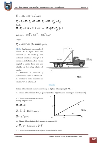 MEC%u00c1NICA PARA INGENIER%u00cdA Y SUS APLICACIONES %u2013DIN%u00c1MICA Cap%u00edtulo IIUNASAM Autor: V%u00cdCTOR MANUEL MENACHO L%u00d3PEZ 200(pie/s)Donde:(pie/s2)Luego:(pie/s2)E2-35.-En el instante representado, el cami%u00f3n de la figura lleva una velocidad de 48 km/hr y est%u00e1 acelerando a raz%u00f3n de 1.5 m/seg2. Si el extremo A de la barra AB de 3 m de longitud se desliza hacia atr%u00e1s con celeridad de 0.6 m/seg relativo al cami%u00f3n.a).-Determinar la velocidad y aceleraci%u00f3n del centro de la barra ABb).-Localizar el centro instant%u00e1neo de rotaci%u00f3n %u201cCi%u201d de la barra AB.Soluci%u00f3nSe trata del movimiento en marcos m%u00f3viles y en el plano del cuerpo r%u00edgido AB.1).-C%u00e1lculo del movimiento de A, si Q es el punto base (Q pertenece al cami%u00f3n pero coincide con A):a).C%u00e1lculo del movimiento del marco m%u00f3vil y del punto base:, (m/s) y(m/s2)b).-C%u00e1lculo del movimiento de A respecto al marco m%u00f3vil:, (m/s) y c).C%u00e1lculo del movimiento de A respecto al marco inercial tierra:P2.35P2-35a%uf0c1