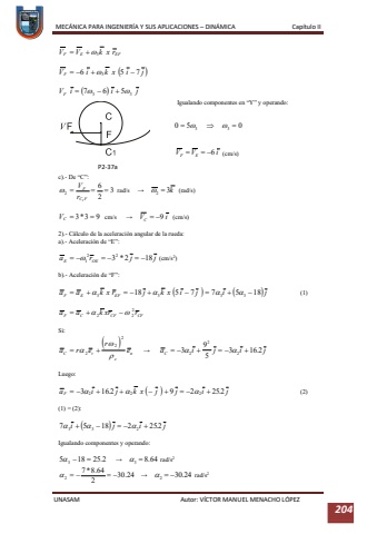 MEC%u00c1NICA PARA INGENIER%u00cdA Y SUS APLICACIONES %u2013DIN%u00c1MICA Cap%u00edtulo IIUNASAM Autor: V%u00cdCTOR MANUEL MENACHO L%u00d3PEZ 204Igualando componentes en %u201cY%u201d y operando:(cm/s)c).-De %u201cC%u201d:rad/s%u2192 (rad/s)cm/s%u2192 (cm/s)2).-C%u00e1lculo de la aceleraci%u00f3n angular de la rueda:a).Aceleraci%u00f3n de %u201cE%u201d:(cm/s2)b).-Aceleraci%u00f3n de %u201cF%u201d:(1)Si:%u2192 Luego:(2)(1) = (2):Igualando componentes y operando:%u2192 rad/s2%u2192 rad/s2P2-37a