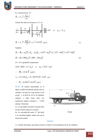 MEC%u00c1NICA PARA INGENIER%u00cdA Y SUS APLICACIONES %u2013DIN%u00c1MICA Cap%u00edtulo IIUNASAM Autor: V%u00cdCTOR MANUEL MENACHO L%u00d3PEZ 211b).-Aceleraci%u00f3n de %u201cA%u201d:C%u00e1lculo delradio de curvatura, si: X = 0:m(m/s2)(1)Tambi%u00e9n:(2)(1) = (2) e igualando componentes:rad/s2(rad/s2)m/s2(m/s2)E2-42.-El cami%u00f3n representado en la figura se halla inicialmente parado ante un sem%u00e1foro. Al tener luz verde acelera a 0.24 m/seg2y el barril de 0.9 m de di%u00e1metro empieza a rodar hacia atr%u00e1s con aceleraci%u00f3n angular constante %u03b1 = 0.025 rad/seg2. Determine:a).-Lo que habr%u00e1 recorrido el cami%u00f3n antes de que el barril caiga por su trasera.b).-La velocidad del centro %u201cC%u201d del barril y su velocidad angular cuando sale por la trasera del cami%u00f3n.Soluci%u00f3n1).-C%u00e1lculo del tiempo, que demora recorrer elcentro G en la plataforma de %uf0c2, por rodadura:P2-42%uf0c2%uf0c1