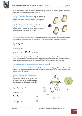MEC%u00c1NICA PARA INGENIER%u00cdA Y SUS APLICACIONES %u2013DIN%u00c1MICA Cap%u00edtulo IIUNASAM Autor: V%u00cdCTOR MANUEL MENACHO L%u00d3PEZ 140en el movimiento, una trayectoria determinada y a todos los dem%u00e1s puntos materiales describir%u00e1n trayectorias equidistantes entre s%u00ed.2.5.1.1.-Traslaci%u00f3n Rectil%u00ednea.-Se da cuando las trayectorias del movimiento de toda las part%u00edculas del cuerpo, son rectas paralelas entre si (ver figura F2-5.1.1).2.5.1.2.-Traslaci%u00f3n Curvil%u00ednea.-Se da si las trayectorias del movimiento de las part%u00edculas del cuerpo, queda a lo largo de l%u00edneas curvas, que entre si son congruentes (ver figura F2-5.1.1).2.5.2.-Estudio del Movimiento.-Como los segmentos del cuerpo no cambian de orientaci%u00f3n respecto a una l%u00ednea o un plano de referencia , el cuerpo no tiene movimiento angular.En (4), (5) y (6):, y Nota.-Como toda las part%u00edculas que conforman el cuerpo r%u00edgido, tienen el mismo movimiento, puede ser considerado como una part%u00edcula (representado generalmente por su centro de masa), por lo tanto ya se hizo el estudio de su movimiento en la cinem%u00e1tica de una part%u00edcula.2.5.2.-Movimiento de rotaci%u00f3n alrededor de un eje fijo en.Es un movimientocon desplazamiento alrededor de una recta fija, pudi%u00e9ndose darse en el espacio o en el plano (generalmente se da cuando es representado en un plano mediante una chapa o disco, ver figura).2.5.2.1.-Estudio del Movimiento.-Para este movimiento el punto base o conveniente se toma en el eje fijo, de tal manera que en lo posible coincida con el punto de referencia O de , luego:En (4), (5) y (6):(7)(8)FiguraF2-5.1.1Figura F2-5.2
