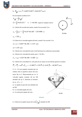 MEC%u00c1NICA PARA INGENIER%u00cdA Y SUS APLICACIONES %u2013DIN%u00c1MICA Cap%u00edtulo IIUNASAM Autor: V%u00cdCTOR MANUEL MENACHO L%u00d3PEZ 212Si: (m/s2)Por movimiento rectil%u00edneo de G:s(igual en cualquier marco)2).C%u00e1lculo del recorrido del cami%u00f3n, cuando G ha recorrido 12 m:mm3).C%u00e1lculo de la velocidad angular del barril, cuando G ha recorrido 12 m:rad/srad/s4).C%u00e1lculo de la velocidad del centro G del barril para las condiciones mencionadas:a).C%u00e1lculo de la velocidaddel cami%u00f3n, para t = 46.188 s:m/sb).C%u00e1lculo de la velocidad de G, como parte de un cuerpo con movimiento general en el plano:(m/s)E2-43.-El cono peque%u00f1o mostrado gira sin resbalar sobre la superficie interior del cono mayor fijo en %uf0c1. Representando por la velocidad angular constante del eje OB alrededor del eje Y, determine en t%u00e9rminos de a).-La rapidez de giro del cono alrededor del eje OB.b).La velocidad angular del cono.c).-La aceleraci%u00f3n angular del cono.Soluci%u00f3n1).-C%u00e1lculo de la rapidez de giro del conoalrededor de OB:P243P2-42aXYCiG%uf0c1