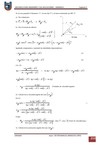 MEC%u00c1NICA PARA INGENIER%u00cdA Y SUS APLICACIONES %u2013DIN%u00c1MICA Cap%u00edtulo IIUNASAM Autor: V%u00cdCTOR MANUEL MENACHO L%u00d3PEZ 213Si, al cono peque%u00f1o lo llamamos%u201c1%u201d, al cono fijo%u201d3%u201d y al marco intermedio eje OB %u201c2%u201d.a).-Por rodamiento:Si: b).Por el teorema de adici%u00f3n:Igualando componentes y operando las identidades trigonom%u00e9tricas:(1)(2)(1)%uf0b8(2):%u2192 %uf05c(Unidades de velocidad angular)2).C%u00e1lculo de la velocidad angular del cono :En (1): %u2192 Luego:%uf05c(Unid. de velocidad ang.)3).-C%u00e1lculo de la aceleraci%u00f3n angular del cono P2-43a
