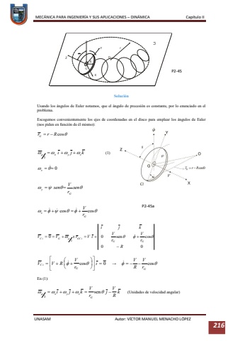 MEC%u00c1NICA PARA INGENIER%u00cdA Y SUS APLICACIONES %u2013DIN%u00c1MICA Cap%u00edtulo IIUNASAM Autor: V%u00cdCTOR MANUEL MENACHO L%u00d3PEZ 216Soluci%u00f3nUsando los %u00e1ngulos de Euler notamos, que el %u00e1ngulo de precesi%u00f3n es constante, por lo enunciado en el problema.Escogemos convenientemente los ejes de coordenadas en el disco paraemplear los %u00e1ngulos de Euler (nos piden en funci%u00f3n de %u00e9l mismo):(1)%u2192 En (1):(Unidades de velocidad angular)P2-45P2-45a%uf0c1