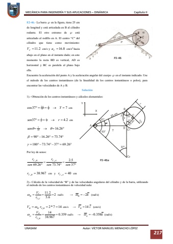 MEC%u00c1NICA PARA INGENIER%u00cdA Y SUS APLICACIONES %u2013DIN%u00c1MICA Cap%u00edtulo IIUNASAM Autor: V%u00cdCTOR MANUEL MENACHO L%u00d3PEZ 217E2-46.-La barra %uf0c3en la figura, tiene 25 cm de longitud y est%u00e1 articulada en B al cilindro rodante. El otro extremo de %uf0c3est%u00e1 articulado al rodilloen A. El centro %u201cC%u201d del cilindro que tiene como movimiento: cm/sy cm/s2 hacia abajo en el plano en el instante dado; en este momento la recta BD es vertical, AD es horizontal y BC es paralela al plano bajo ella. Encuentre la aceleraci%u00f3n del punto A y la aceleraci%u00f3n angular del cuerpo %uf0c3en el instante indicado. Use el m%u00e9todo de los centros instant%u00e1neos (de la linealidad de los centros instant%u00e1neos o polos), para encontrar las velocidades de A y B.Soluci%u00f3n1).Obtenci%u00f3n de los centros instant%u00e1neos y c%u00e1lculos elementales:cmcmPor ley de senos:cm y cm2).C%u00e1lculo de la velocidad de %u201cB%u201d y de las velocidades angulares del cilindro y de la barra, utilizando el m%u00e9todo de los centros instant%u00e1neos de velocidad nula:rad/s%u2192 (rad/s)cm/s%u2192 (cm/s)rad/s%u2192 (rad/s)P246P2-46aY%uf067