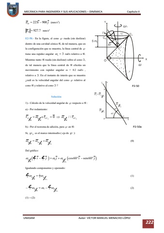 MEC%u00c1NICA PARA INGENIER%u00cdA Y SUS APLICACIONES %u2013DIN%u00c1MICA Cap%u00edtulo IIUNASAM Autor: V%u00cdCTOR MANUEL MENACHO L%u00d3PEZ 222(mm/s2)mm/s2E2-50.-En la figura, el cono %uf0c3rueda (sin deslizar) dentro de una cavidad c%u00f3nica %uf0c2, de tal manera, que en la configuraci%u00f3n que se muestra, la l%u00ednea central de %uf0c3tiene una rapidez angular rad/srelativo a %uf0c2. Mientras tanto %uf0c2rueda (sin deslizar) sobre el cono %uf0c1, de tal manera que la l%u00ednea central de %uf0c2efect%u00faa un movimiento con rapidez angular %uf077= 0.2 rad/s, relativo a %uf0c1. En el instante de inter%u00e9s que se muestra %u00bfcu%u00e1les la velocidad angular del cono %uf0c3relativo al cono %uf0c2y relativo al cono %uf0c1?Soluci%u00f3n1).C%u00e1lculo de la velocidad angular de %uf0c3respecto a %uf0c2:a).-Por rodamiento:b).Por el teorema de adici%u00f3n, para %uf0c3en %uf0c2:Si, es el marco intermedio ( eje de ):(0)Del gr%u00e1fico:Igualando componentes y operando:(1)(2)(1) %uf0b8(2):P2-50P2-50a