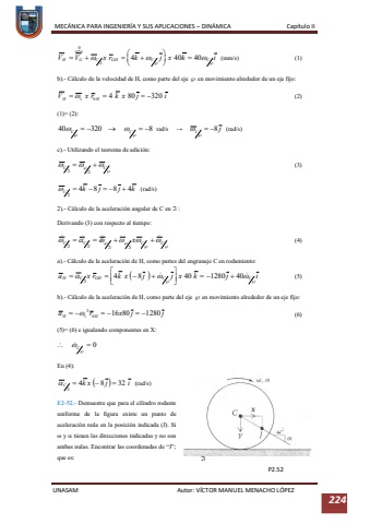 MEC%u00c1NICA PARA INGENIER%u00cdA Y SUS APLICACIONES %u2013DIN%u00c1MICA Cap%u00edtulo IIUNASAM Autor: V%u00cdCTOR MANUEL MENACHO L%u00d3PEZ 224(mm/s) (1)b).-C%u00e1lculo de la velocidad de H, como parte del eje %uf0c3en movimiento alrededor de un eje fijo:(2)(1)= (2):rad/s%u2192 (rad/s)c).Utilizando el teorema de adici%u00f3n:(3)(rad/s)2).-C%u00e1lculo de la aceleraci%u00f3n angular de C en %uf0c1:Derivando (3) con respecto al tiempo:(4)a).-C%u00e1lculo de la aceleraci%u00f3n de H, como partes del engranajeC en rodamiento:(5)b).-C%u00e1lculo de la aceleraci%u00f3n de H, como parte del eje %uf0c3en movimiento alrededor de un eje fijo:(6)(5)= (6) e igualando componentes en X:En (4):(rad/s)E2-52.-Demuestre que para el cilindro rodante uniforme de la figura existe un punto de aceleraci%u00f3n nula en la posici%u00f3n indicada (J). Si %uf077y %uf061tienen las direcciones indicadas y no son ambas nulas. Encontrar las coordenadas de %u201cJ%u201d; que es:P2.52%uf0c1