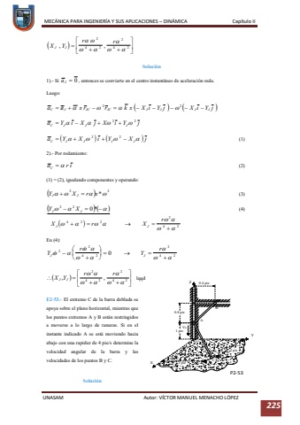 MEC%u00c1NICA PARA INGENIER%u00cdA Y SUS APLICACIONES %u2013DIN%u00c1MICA Cap%u00edtulo IIUNASAM Autor: V%u00cdCTOR MANUEL MENACHO L%u00d3PEZ 225Soluci%u00f3n1).Si , entonces se convierte en el centro instant%u00e1neo de aceleraci%u00f3n nula.Luego:(1)2).-Por rodamiento:(2)(1) = (2), igualando componentes y operando:(3)(4)En (4):lqqdE2-53.-El extremo C de la barra doblada se apoya sobre el plano horizontal, mientras que los puntos extremos A y B est%u00e1n restringidos a moverse a lo largo de ranuras. Si en el instante indicado A se est%u00e1 moviendo hacia abajo con una rapidez de 4 pie/sdetermine la velocidad angular de la barra y las velocidades de los puntos B y C.Soluci%u00f3nP2-53