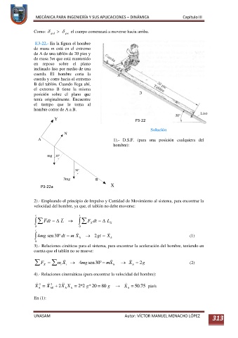 3).- Relaciones cinéticas para el sistema, para encontrar la aceleración del hombre, teniendo en