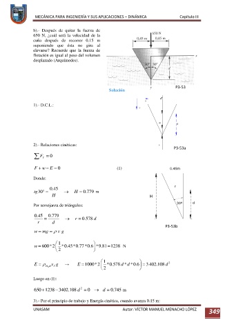 3).- Por el principio de trabajo y Energía cinética, cuando avanza 0.15 m: