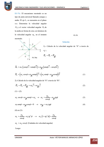 MEC%u00c1NICA PARA INGENIER%u00cdA Y SUS APLICACIONES %u2013DIN%u00c1MICA Cap%u00edtulo IIUNASAM Autor: V%u00cdCTOR MANUEL MENACHO L%u00d3PEZ 256E1-74.-El mecanismo mostrado es un tipo de junta universal llamada yunque y ara%u00f1a. El eje L, se encuentra en el plano xz. Determine la velocidad angular y el vector velocidad angular de laara%u00f1a en forma de cruz, en t%u00e9rminos de la velocidad angular en el instante mostrado.Soluci%u00f3n1).-C%u00e1lculo de la velocidad angular de %u201cS%u201d a trav%u00e9s de %u201cL%u201d:(1)2).-C%u00e1lculo de la velocidad angular de %u201cS%u201d a trav%u00e9s de %u201cR%u201d:(2)(1) = (2):(3)(4)(4) en (3):(Unidades de velocidad angular)Luego:P174P174a