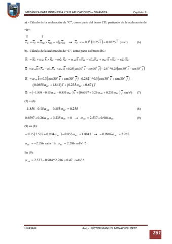 MEC%u00c1NICA PARA INGENIER%u00cdA Y SUS APLICACIONES %u2013DIN%u00c1MICA Cap%u00edtulo IIUNASAM Autor: V%u00cdCTOR MANUEL MENACHO L%u00d3PEZ 261a).C%u00e1lculo de la aceleraci%u00f3n de %u201cC%u201d, como parte del brazo CD, partiendo de la aceleraci%u00f3n de %u201cD%u201d:(m/s2) (6)b).-C%u00e1lculo de la aceleraci%u00f3n de %u201cC%u201d, como parte del brazo BC:(m/s2) (7)(7) = (6):(8)(9)(9) en (8):rad/s2%u00f3 rad/s2%u21bbEn (9):rad/s2%u21ba