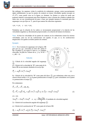 MEC%u00c1NICA PARA INGENIER%u00cdA Y SUS APLICACIONES %u2013DIN%u00c1MICA Cap%u00edtulo IIUNASAM Autor: V%u00cdCTOR MANUEL MENACHO L%u00d3PEZ 149Sin embargo, los engranes violan la condici%u00f3n de rodamiento, porque, existe necesariamente alg%u00fan resbalamiento, ya que los puntos de contacto no tienen velocidades iguales (excepto en ), como puede verse en la figura, no obstante, los dientes se cortan de modo que podemos tratarlos correctamente para fines din%u00e1micos como si fueran dos cilindros rodando uno sobre otro, en sus circunferencias de paso o base, por ejemplo tenemos lo mostrado para dos engranajes con ejes fijos en , para la que usamos las relaciones siguientes:y Not%u00e1ndose que la relaci%u00f3n de los radios es inversamente proporcional a la relaci%u00f3n de las velocidades angulares (y directamente proporcionales a la relaci%u00f3n del n%u00famero de dientes).Nota.-Si bien las velocidades de los puntos de contacto en los rodamientos tienen las mismas velocidades, pero no as%u00ed las aceleraciones son iguales, lo que, es si, las aceleraciones tangenciales son iguales en dichos puntos de contacto. Ejemplo:E2-3.-En el sistema de engranajes de la figura, OB gira con %u03c9By %u03b1Bconocidas en torno del punto O fijo. El pi%u00f1%u00f3n %u2460, de centro O, tiene %u03c91y %u03b11tambi%u00e9n conocidas. Se pide los Valores de %u03c92y %u03b12. Si OC = r y BC = 2r.Soluci%u00f3n1).-C%u00e1lculo de la velocidad angular del engranaje %u2461.a).C%u00e1lculo de la velocidad de %u201cB%u201d como parte de la barra OB en movimiento alrededor de un eje fijo:(1)b).-C%u00e1lculo de la velocidad de %u201cB%u201d como parte del disco %u2461, con rodamiento sobre una curva c%u00f3ncava hacia arriba, si A1es el punto perteneciente al cuerpo %u2460, pero coincidente con el punto A2pertenecienteal cuerpo %u2461:Por rodamiento:(2)(1) = (2):%u21ba(unidades de velocidad angular)2).-C%u00e1lculo de la aceleraci%u00f3n angular del engranaje %u2461:a).-C%u00e1lculo de la aceleraci%u00f3n de %u201cB%u201d como parte de la barra OB:(3)P2-3