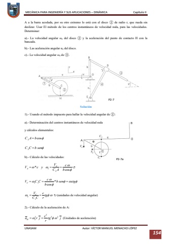 MEC%u00c1NICA PARA INGENIER%u00cdA Y SUS APLICACIONES %u2013DIN%u00c1MICA Cap%u00edtulo IIUNASAM Autor: V%u00cdCTOR MANUEL MENACHO L%u00d3PEZ 154A a la barra acodada, por su otro extremo lo est%u00e1 con el disco %u2461de radio r, que rueda sin deslizar. Usar El m%u00e9todo de los centros instant%u00e1neos de velocidad nula, para las velocidades. Determinar:a).-La velocidad angular %u03c92del disco %u2461y la aceleraci%u00f3n del punto de contacto H con la bancada.b).-Las aceleraci%u00f3n angular %u03b12del disco.c).-La velocidad angular %u03c93de %u2462.Soluci%u00f3n1).Usando el m%u00e9todo impuesto para hallar la velocidad angular de %u2461:a).-Determinaci%u00f3n del centros instant%u00e1neos de velocidad nula y c%u00e1lculos elementales:b).C%u00e1lculo de las velocidades:%u21ba%u21bb(unidades de velocidad angular)2).-C%u00e1lculo de la aceleraci%u00f3n de A:(Unidades de aceleraci%u00f3n)P27P2-7a