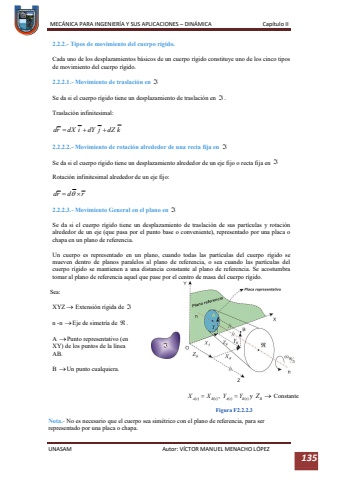 MEC%u00c1NICA PARA INGENIER%u00cdA Y SUS APLICACIONES %u2013DIN%u00c1MICA Cap%u00edtulo IIUNASAM Autor: V%u00cdCTOR MANUEL MENACHO L%u00d3PEZ 1352.2.2.-Tipos de movimiento del cuerpo r%u00edgido.Cada uno de los desplazamientos b%u00e1sicos de un cuerpo r%u00edgido constituye uno de los cinco tipos de movimiento del cuerpo r%u00edgido.2.2.2.1.-Movimiento de traslaci%u00f3n en Se da si el cuerpo r%u00edgido tiene un desplazamiento de traslaci%u00f3n en .Traslaci%u00f3n infinitesimal:2.2.2.2.-Movimiento de rotaci%u00f3n alrededor de una recta fija en Se da si el cuerpo r%u00edgido tiene un desplazamiento alrededor de un eje fijo o recta fija en Rotaci%u00f3n infinitesimal alrededor de un eje fijo:2.2.2.3.-Movimiento General en el plano en Se da si el cuerpo r%u00edgido tiene un desplazamiento de traslaci%u00f3n de sus part%u00edculas y rotaci%u00f3n alrededor de un eje (que pasa por el punto base o conveniente), representado por una placa o chapa en un plano de referencia. Un cuerpo es representado en un plano, cuando todas las part%u00edculas del cuerpo r%u00edgido se mueven dentro de planos paralelos al plano de referencia, o sea cuando las part%u00edculas del cuerpo r%u00edgido se mantienen a una distancia constante al plano de referencia. Se acostumbra tomar al plano de referencia aquel que pase por el centro de masadel cuerpo r%u00edgido.Sea:XYZExtensi%u00f3n r%u00edgida de n -n Eje de simetr%u00eda de .A Punto representativo (en XY) de los puntosde la l%u00ednea AB.B Un punto cualquiera.Nota.-No es necesario que el cuerpo sea sim%u00e9trico con el plano de referencia, para ser representado por una placa o chapa.Figura F2.2.2.3y Constante