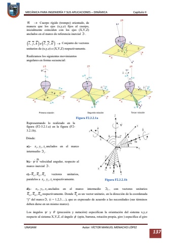 MEC%u00c1NICA PARA INGENIER%u00cdA Y SUS APLICACIONES %u2013DIN%u00c1MICA Cap%u00edtulo IIUNASAM Autor: V%u00cdCTOR MANUEL MENACHO L%u00d3PEZ 137Cuerpo r%u00edgido (trompo) orientado, de manera que los ejes (x,y,z) fijos al cuerpo, inicialmente coinciden con los ejes (X,Y,Z) anclados en el marco de referencia inercial .Conjunto de vectores unitarios de (x,y,z) e (X,Y,Z) respectivamente.Realizamos los siguientes movimientos angulares en forma secuencial:Representando lo realizado en la figura (F2-3.2.1.a) en la figura (F2-3.2.1b).D%u00f3nde:a).-anclados en el marco intermedio .b).-velocidad angular, respecto al marco inercial .c).-vectores unitarios, paralelos a respectivamente. d).-anclados en el marco intermedio , con vectores unitarios respectivamente. Donde es un vector unitario, en la direcci%u00f3n de la coordenada %u201cj%u201d del marco(i = 1,2,3.....), que es expresado de acuerdo a las necesidades (sus t%u00e9rminos deben darse en un mismo marco). Los %u00e1ngulos y (precesi%u00f3n y nutaci%u00f3n) especifican la orientaci%u00f3n del sistema x,y,z respecto al sistema X,Y,Z, el %u00e1ngulo (spin, barrena, rotaci%u00f3n propia, giro ) especifica el giro Figura F2.3.2.1aFigura F2.3.2.1b