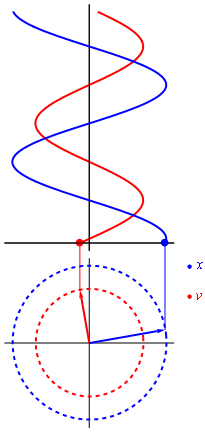 En el plano complejo, el fasor de la velocidad está girado 90° respecto al de la posición, como resultado de la multiplicación por la velocidad imaginaria.