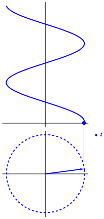 La parte real de este número complejo rotatorio, esto es, su proyección sobre el eje de abscisas, representa una oscilación cosenoidal. La parte imaginaria oscila igualmente, pero como un seno, esto es, desfasada un cuarto de periodo.